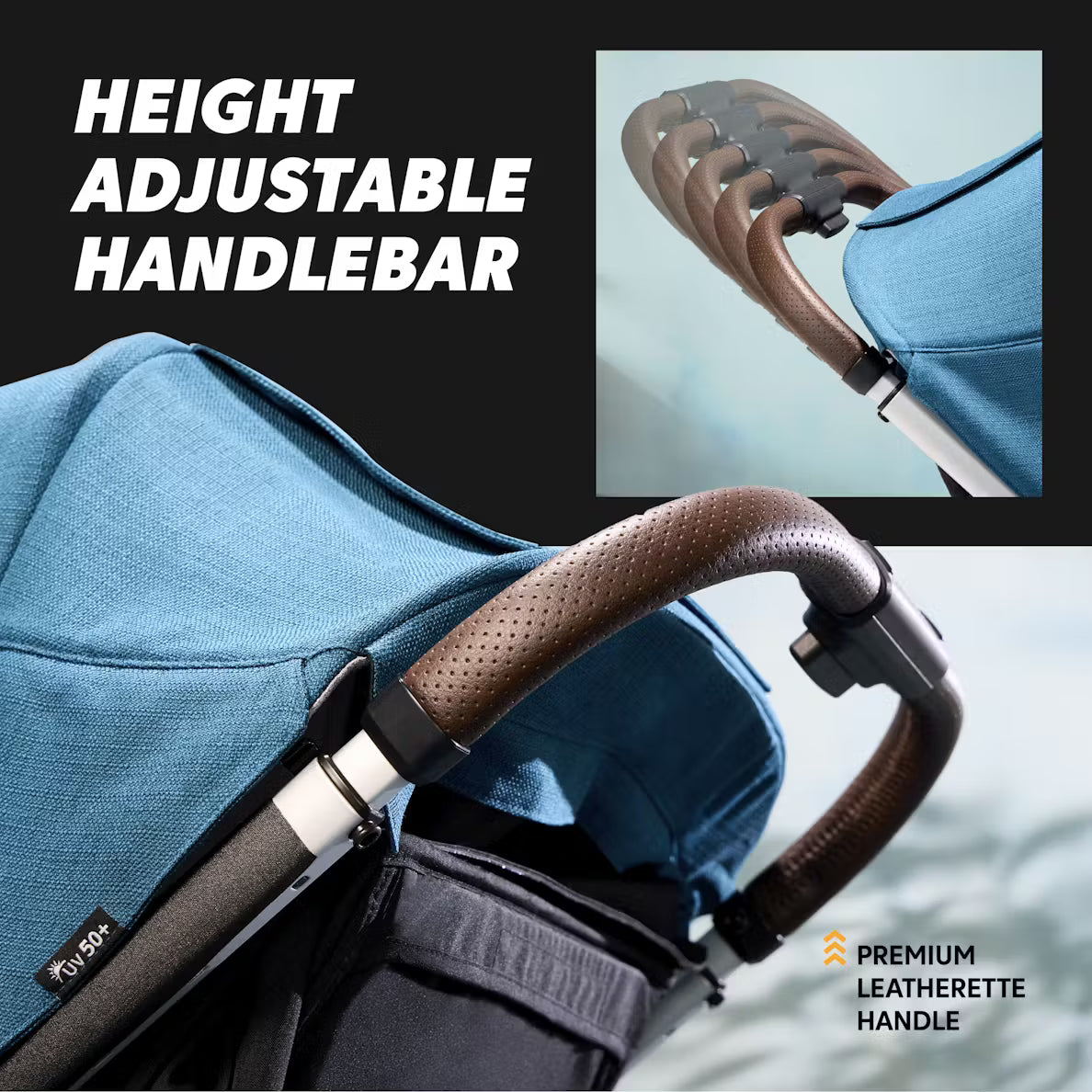 • Height-adjustable handlebar with leatherette grip provides a premium push experience