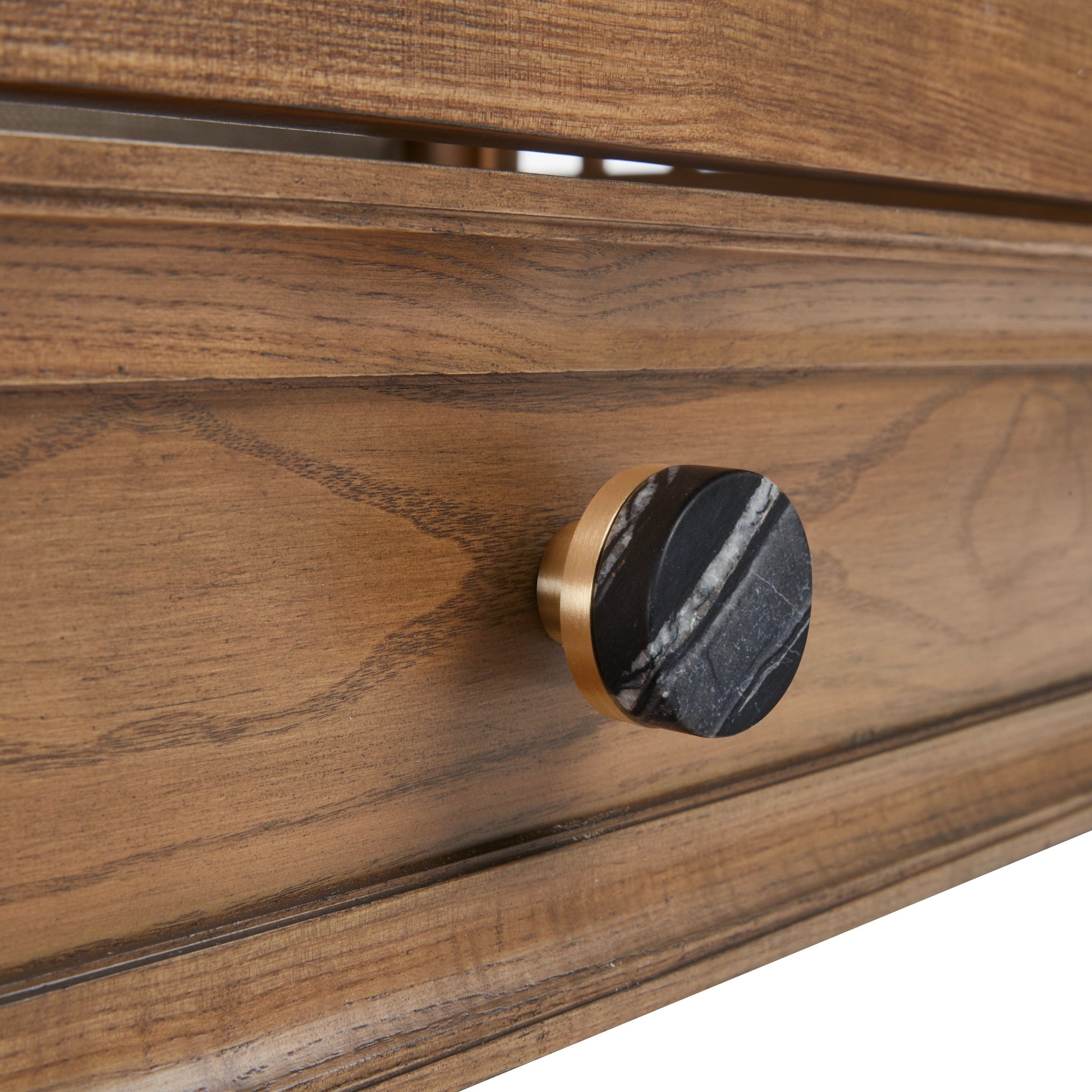 • Built-in under-crib storage drawer accented with marble and brass drawer knob.